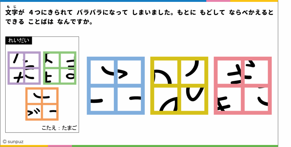 文字をくみたててから、ならびかえてことばを作るパズルです。文字の形をイメージ... -