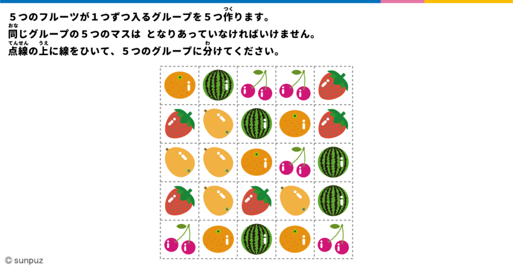 4しゅるいのフルーツを4つのグループに分けるパズルです。論理的思考力、集中力... -