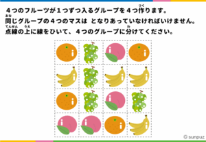 4しゅるいのフルーツが4つずつあります。4つのフルーツが1つずつ入ったグループを4つ作ってください。ただし、同じグループにはいるマスはつながっていなくてはいけません。