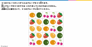 保護中: フルーツグループ分けパズル 上級編(8) 思考のセンスを磨くマスパズル 2025 10/02 フルーツグループ分けパズル 上級編 2026年3月3日このコンテンツはパスワードで保護されています。閲覧するには以下にパスワードを入力してください。パスワード: フルーツグループ分けパズル 上級編 小学6年生 小学校高学年 思考のセンス 論理的思考力 この記事が気に入ったら フォローしてね! Follow @puzzlehall よかったらシェアしてね! URLをコピーしました! URLをコピーしました! 大きい数小さい数(11) 理解力と思考力で解き進める このパズルの作者 パズル作家 北村 パズル作家 パズル作家。著書は30冊以上累計50万部ほど。 パズル・クイズの作成や、心理テスト・星座占いなどのコンテンツ作成、思考実験、ストーリー執筆などをしています。 お仕事のご依頼はお問い合わせフォームからお願いします。 関連記事 フルーツグループ分けパズル 上級編(7) 思考のセンスを磨くマスパズル 2026年2月2日 フルーツグループ分けパズル 上級編(6) 思考のセンスを磨くマスパズル 2025年12月29日 フルーツグループ分けパズル 上級編(5) 思考のセンスを磨くマスパズル 2025年11月14日 フルーツグループ分けパズル 上級編(4) 思考のセンスを磨くマスパズル 2025年10月6日 フルーツグループ分けパズル 上級編(3) 思考のセンスを磨くマスパズル 2025年9月17日 フルーツグループ分けパズル 上級編(2) 思考のセンスを磨くマスパズル 2025年9月2日 フルーツグループ分けパズル 上級編(1) 思考のセンスを磨くマスパズル 2025年9月1日