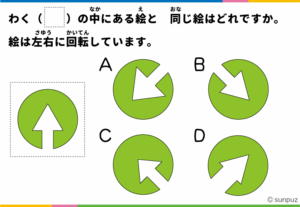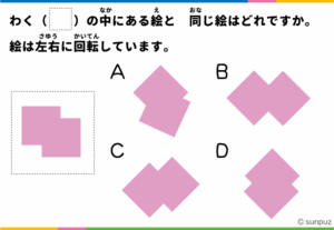 □の中にある絵と同じ絵はどれですか。A~Dの中から選んでください。A~Dの絵は左右に回転しています。頭の中で向きを合わせながらひかくしましょう。
