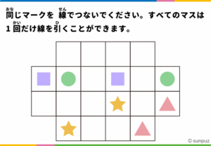 ●と●、★と★など、同じマークを線でつないでください。すべてのマスは1回だけ線を引くことができます。