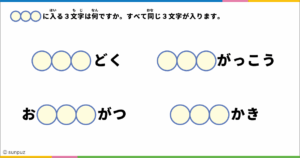 4つの言葉の空いている3文字には、同じ言葉が入ります。ヒラメキ力や発想力と知っている言葉を思い出す力(想起力/記憶力)を使って、正解を言い当てるパズルです。