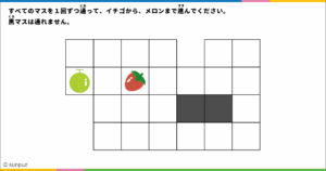 イチゴから進むマスは上下左右4通りあります。むずかしいと思ったら、メロンから考えてみるのも手です。